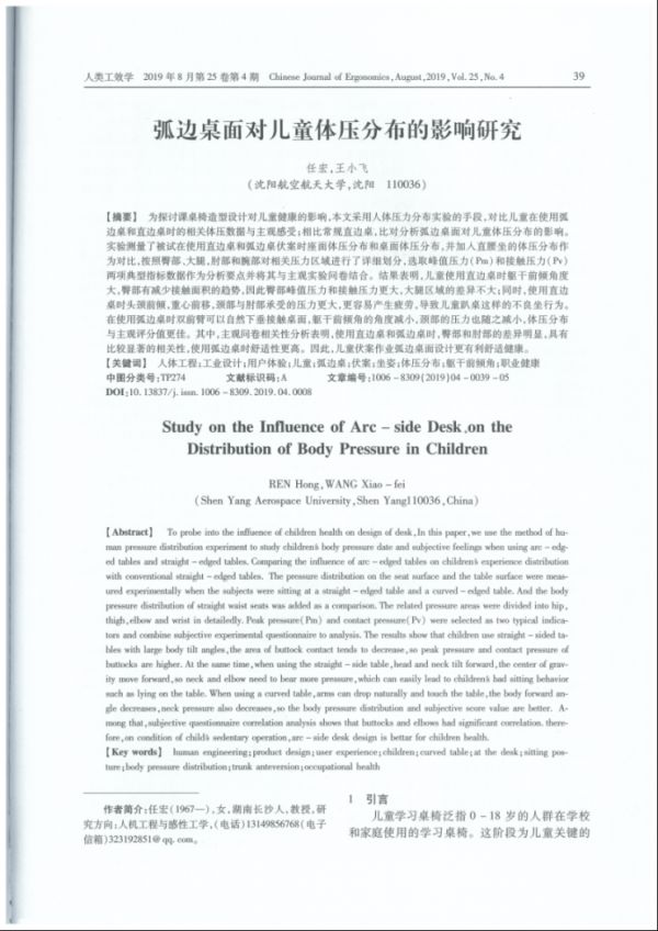 2019年,教育部主管的《人类工效学》杂志发表论文,推荐使用弧边桌:使用弧边桌进行伏案作业,臀部和肘部承受的压力更小,其主要原因是在使用弧边桌时,躯干进人强口,双前臂垂直落下时即可以接触桌面,身体前倾的角度更小,因此身体重心前移的量和脊柱承受的压力更小,疲劳度降低,减少了儿童趴桌行为的概率,降低脊柱变形、驼背、耸肩等不良影响发生的可能性。