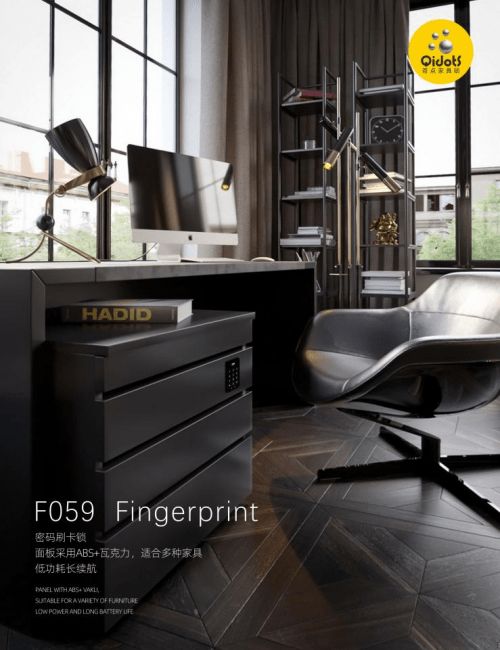 奇点家具锁F059外观商务时尚,集合刷卡和密码功能,支持安装在办公抽屉柜、文件柜、储物柜等办公家具。