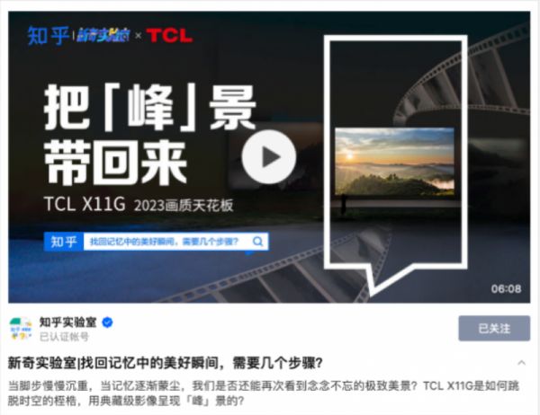 作为“2023画质天花板”,TCL X11G毫无疑问是一款巅峰画质之作,在此次知乎新奇实验室助力逐梦一事中也是最大程度上展现了其“双5000”的强大画质实力。