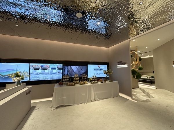 当参展者从艺术走廊区穿过,映入眼帘的便是水波纹顶的前台接待区,温和轻松的设计让步入这里的人变得平和舒适。长达8米的视频图片展示区向所到宾客演绎了品牌逾半世纪的发展史。