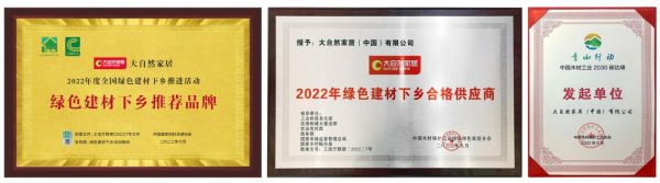 一直以来,大自然家居秉承“担环保责任 普健康生活 做健康家居”企业理念,从绿色原材料供应、绿色生产智造,绿色创新技术、绿色销售服务等每一个环节上坚持健康、环保,全方位的为消费者提供绿色家居产品,打造健康人居生活。值得一提的是, 大自然家居凭借优质的绿色产品和绿色发展实践,2022年6月大自然家居旗下的强化地板、实木复合地板已入选由工信部公布的全国绿色建材产品清单和企业名录,并获得由中国建材流通协会颁发的“2022年全国绿色建材下乡推荐品牌”、由中国木材保护工业协会颁发的“2022年全国绿色建材下乡合格供应商”、“中国木材工业2030碳达峰发起单位”等奖项荣誉。今年3月,大自然家居更是成功入选《佛山市绿色建材目录》,助力国家加快绿色建材产品推广。