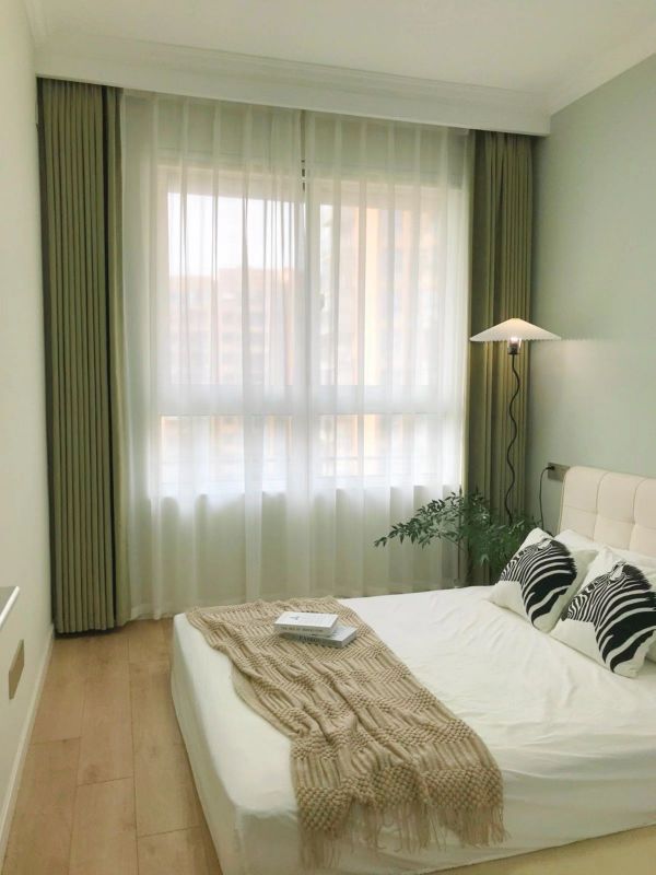 当然卧室窗帘也可以搭配一款轻盈而通透的纱帘,这不仅能大大减少视觉上的压抑感,还能在有风的日子里随风起舞,让家里透进更多的阳光和自然风景,美观度大大提升。