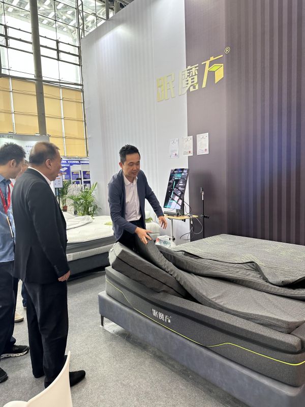 眠魔方床垫作为第51届中国(广州)国际家具博览会的参展品牌,在本次展会上首度亮相M1 和K1两个极具分量及创新的智慧床垫产品,吸引了大量国内外同行和消费者关注,同时中国睡眠研究会秘书长左和鸣也莅临眠魔方寝具展位,聆听产品介绍和反馈专业意见。