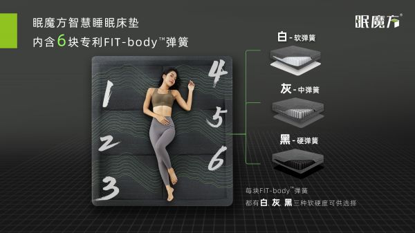 眠魔方,依托独立开发的智慧睡眠系统,以及行业独创的6块FIT-BODY弹簧模块设计,将人体数据和床垫的软硬度、支撑度进行有效匹配,为消费者提供符合其身体数据、睡眠需求的定制床垫,能做到每个人数据不同,定制不同,左右两边睡感需求不同,定制不同,从而有效地提高用户的睡眠质量。目前,品牌旗下的多个产品已获得多个国家专利。