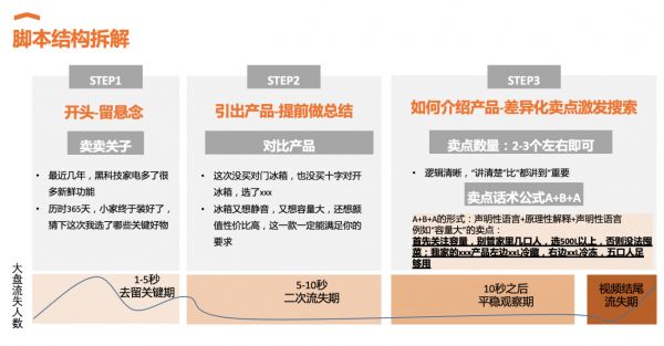 从流失曲线来看,达人视频在去留关键期的前5s后,后续流失可分为三个阶段。在引出产品期与产品介绍阶段,可以借助高搜索脚本的通用结构拆解,对内容进行阶段式输出,将用户流失的可能性降至最低。
