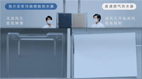 视频中,实验人员将相同的A4纸分别放在启动的海尔“全密闭稳燃舱”热水器和普通燃气热水器的背面。很明显,海尔热水器背面的A4纸一放即掉,普通热水器的进风孔则将A4张牢牢吸住。