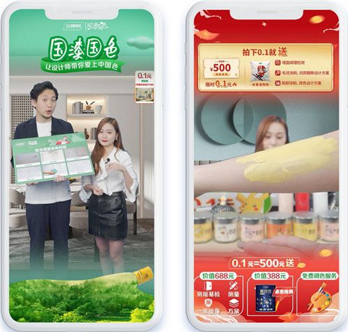 在这一整体思路下,针对C端消费者,三棵树携手盟运营团队打造了多个场景以匹配不同的直播目的。例如,“现场涂料场景”通过最直观的形式展现产品颜色、亮度等特征,吸引目标群体观看;而在以带货为主要目标的重大营销节点期间,微盟又会根据不同的节日热点替换直播间风格,配合专属福利,激励用户留资、下单。不但如此,双方还在上海微盟短视频中心搭建了专属直播场地,并首次尝试蓝幕+实景切镜头的直播形式。