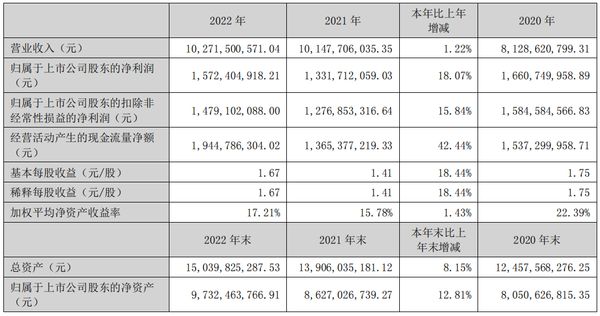 面对诸多不利因素的影响,老板2022业绩实现逆势增长,全年实现营业收入 102.72 亿元,同比增长 1.22%;归属于上市公司股东的净利润 15.72 亿元,同比增长 18.07%;归母净利润15.72亿元,同比增长18.07%,盈利能力良好;经营性现金流1.94亿元,同比增长42.44%,营业能力突出,均大幅优于行业平均水平,站在了行业的前列。