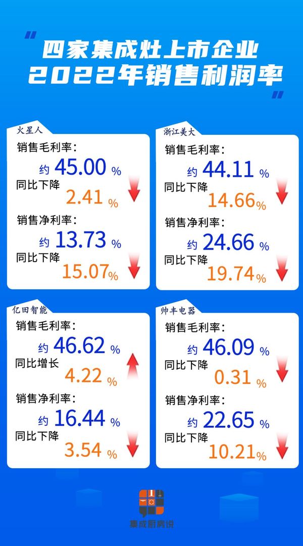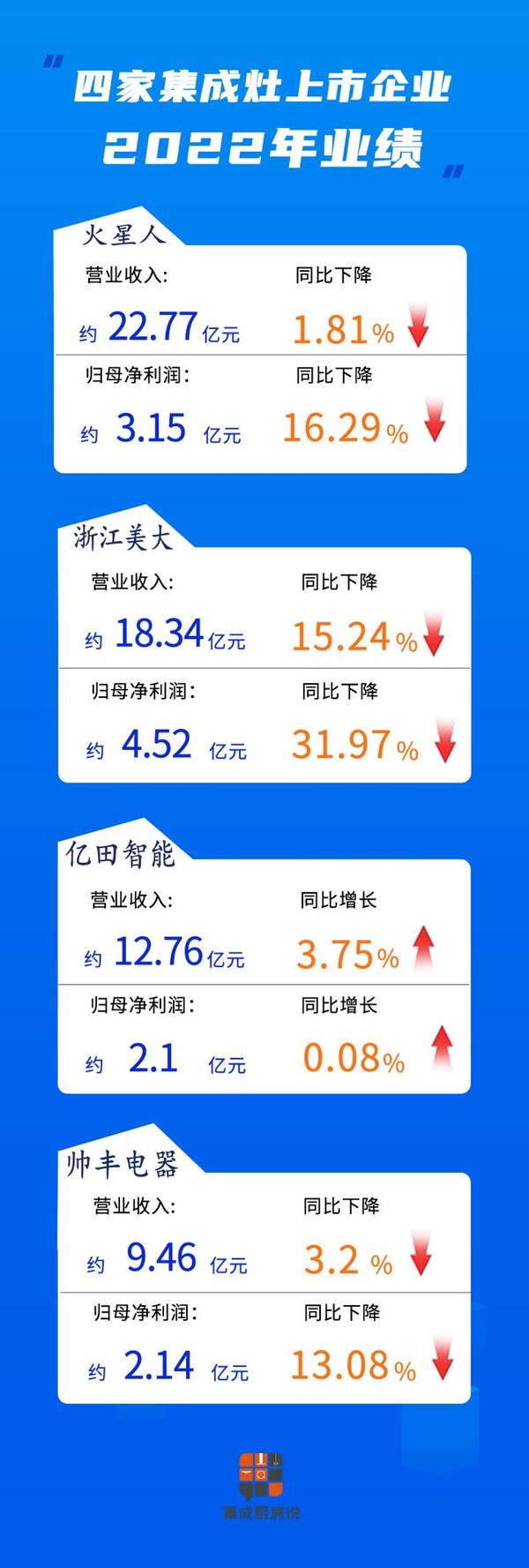 随着4月24日火星人2022财报发布,至此,包括其在内,浙江美大、亿田智能和帅丰电器,四家集成灶上市企业年报尽出。