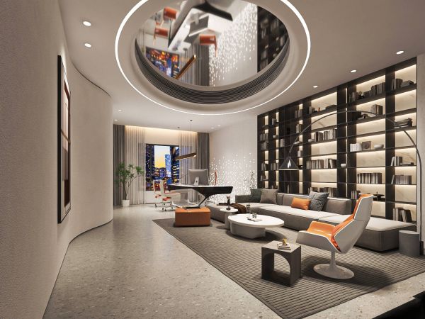 挑空客厅的设计使得办公空间在通透感十足的氛围中艺术感拉满。黑白灰的主色设计让人尤为放松。墙面放弃一贯的直线改为流线型,时尚黄色家具点缀其间,干净简约,冷暖呼应。