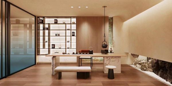 白居易说:“何以销烦暑,端居一院中”。让清茶与清谈成为最文艺的消暑方式,茶室极简的无主灯设计如同这城市树下的阴凉给人以庇护。一抹渐变蓝的玻璃阻隔阳光的窥探与强抚,给予一段时光里最幽静的午后惬意与宁静。