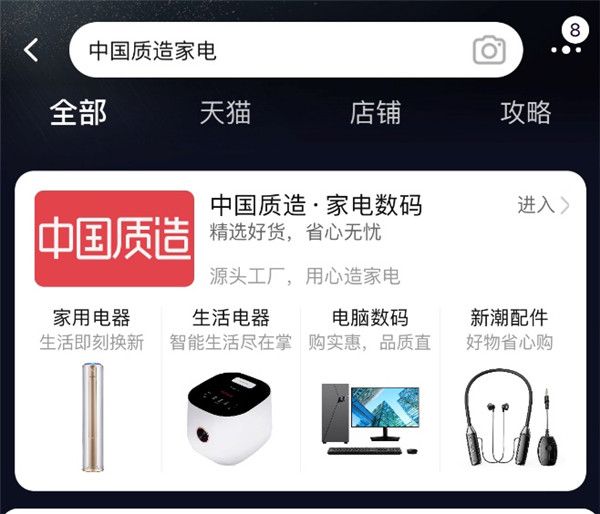 早在5月起,当我们在手淘输入关键字“中国质造家电/数码”,即可看到大量已点亮 “中国质造/数码”的家电好物,以及进入今年 “中国质造”的618专属会场。