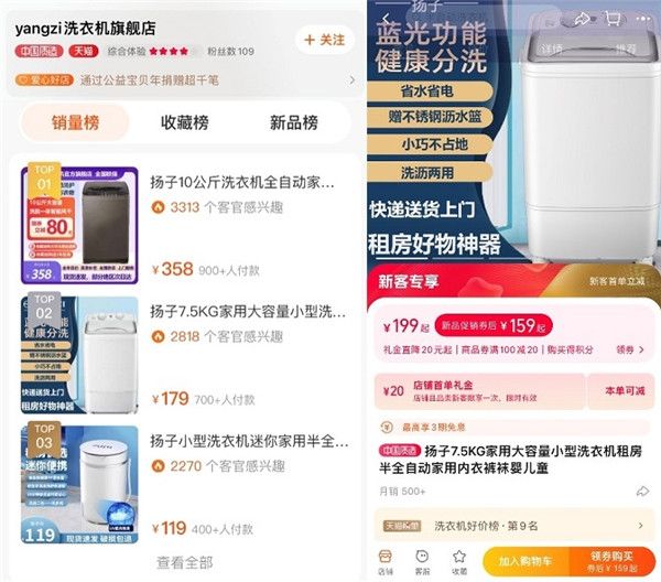 中国质造商家“yangzi洗衣机旗舰店”天猫店和产品页面