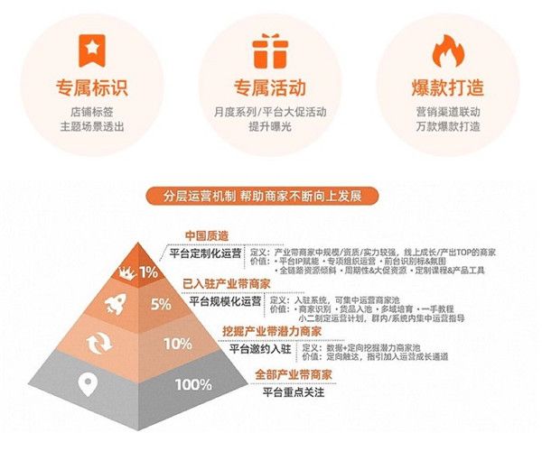 针对入驻产业带的商家,平台将提供分层运营机制和清晰明确的成长助力路径。而通过层层甄选,最终闪耀着“中国质造”标识的商家,都是产业带中位于金字塔尖、百里挑一的优秀国货品牌。平台将会为其打造定制化扶持政策和权益,比如全链路透标,包含点亮中国质造的店铺标、详情标题和待上线的搜索标;以及专属会场的活动曝光,包含消费电子主会场楼层和行业分会场。尤其针对入驻天猫的“中国质造”商家,平台将会有更高权重的扶持权益倾斜。