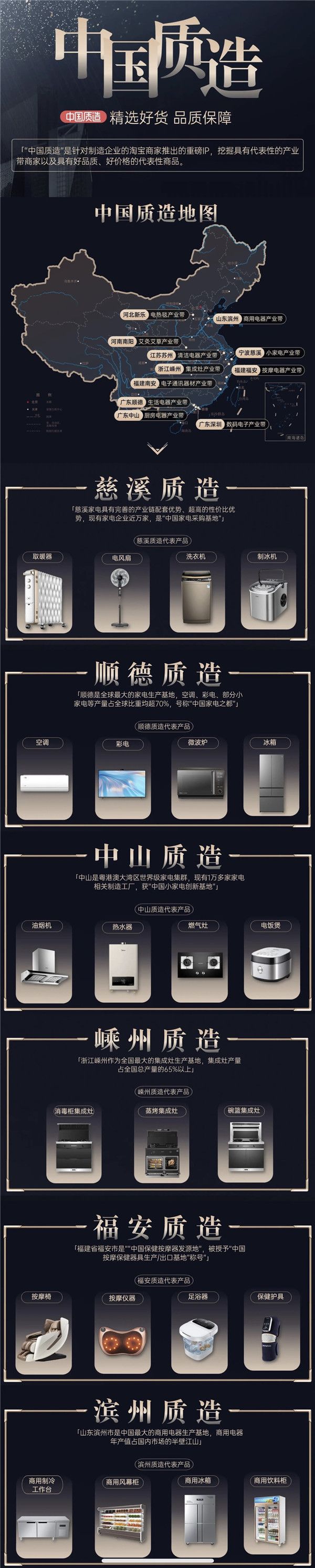 透过这份地图的指引,消费者可以清晰快速地溯源高品质&高性价比的家电,譬如慈溪的取暖机、电风扇、电熨斗、饮水机,顺德的空调、彩电、微波炉、冰箱,中山的油烟机、热水器、燃气灶、电饭煲,还有福安的按摩椅、按摩仪器、足浴器、保健护具……家里大大小小的家电几乎都可以在这里一站式购齐。每件标注着“中国质造”的商品,都闪耀着家电界的“国货之光”。