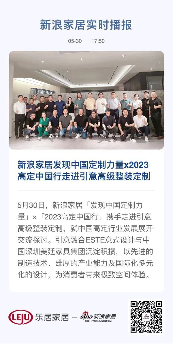 5月30日,新浪家居「发现中国定制力量」×「2023高定中国行」携手走进引意高级整装定制,就中国高定行业发展展开交流探讨。引意融合ESTE意式设计与中国深圳美廷家具集团沉淀积攒,以先进的制造技术、雄厚的产业能力及国际化多元化的设计,为消费者带来极致空间体验。