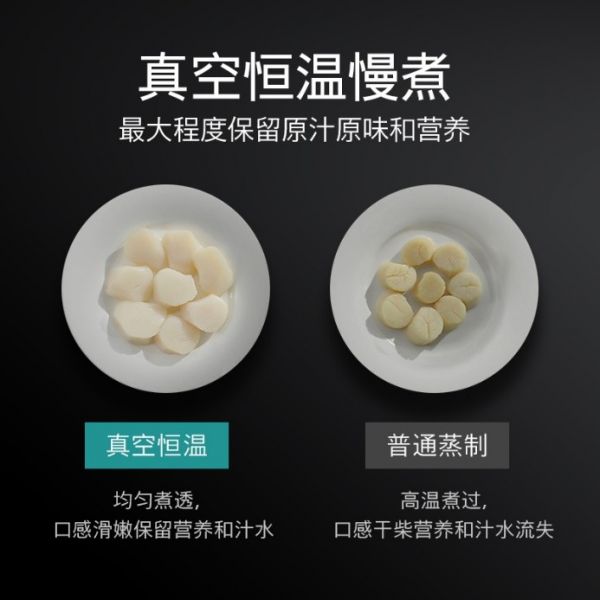 在真空恒温慢煮模式下,只需3步就可在家享用米其林级别的美食。第一步,需要对新鲜的食材进行入味、腌制处理;第二步对食材进行抽真空处理;第三步将抽真空后的食材放入腔内,设定精控推荐温度和时间,启动模式即可以一键获得优质美味。
