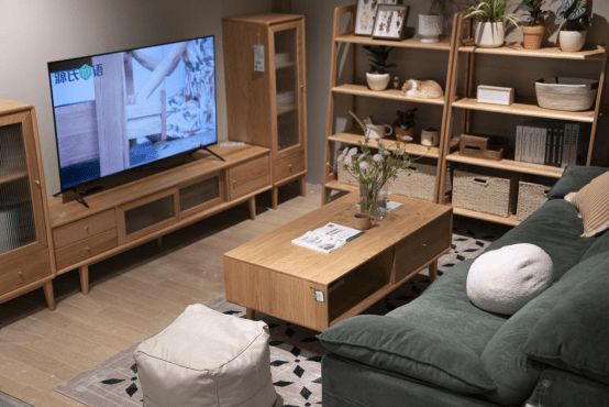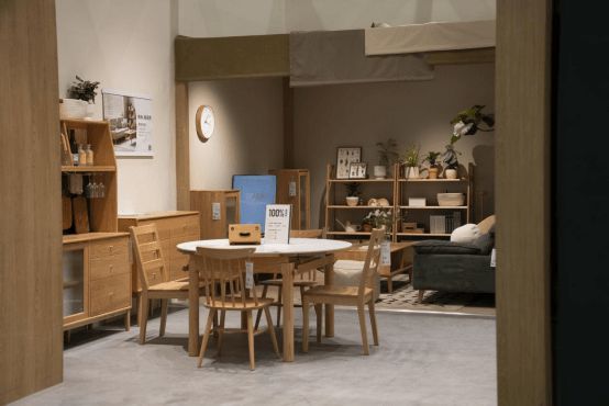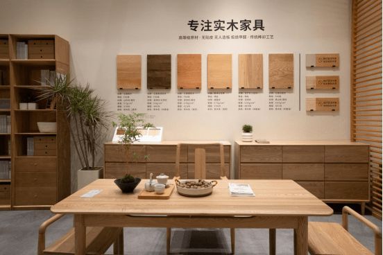 原木生活馆以“有木 有自然”、“有木 有桃花源”等为主题,以木材分为黑胡桃木、樱桃木、橡木等专区,并将产品系列按照“客厅”、“餐桌”、“卧室”、“书房”等使用场景成套展现,真实还原生活场景。