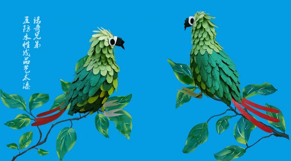 细心的小伙伴会发现,老师和小童模的手上和肩上各有一只彩色的鸟。没错,它是由设计师用5防水性成品艺术漆制作的小鹦鹉,满身翠绿,樱红色的锥尾,层层叠叠的羽毛,仿佛化身模特的小精灵 ,元气满满地登上了此次时装展。