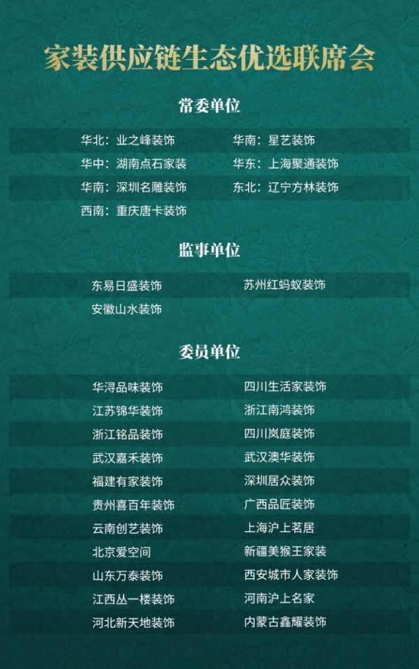 为此,由全国及区域的19家头部家装企业联合发起成立家装供应链生态优选联席会,提请中国建筑装饰协会住宅装饰装修和部品产业分会协调组织,联席会秘书处设立在中国建筑装饰协会住宅装饰装修和部品产业分会秘书处。
