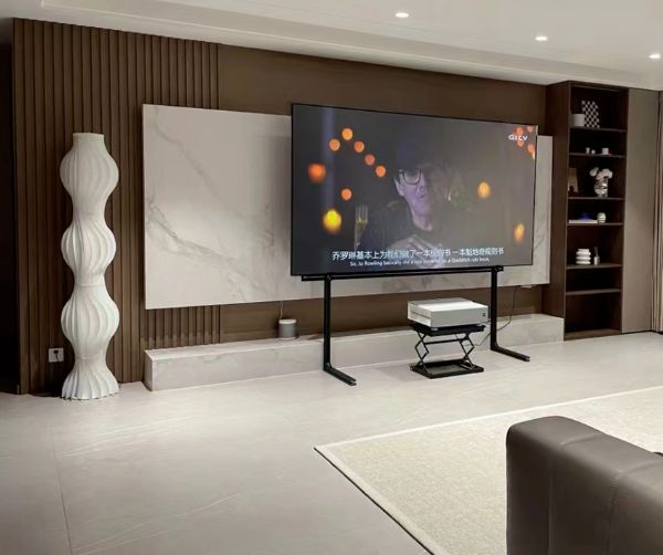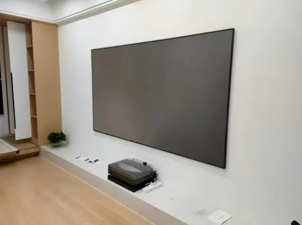 通常,安装激光电视时需要同时挂好抗光幕布,然后调整激光电视主机焦距。抗光幕布尺寸大且必须保持平整用来保证最佳的观影效果,另外还要经过一系列的对焦过程,耗时又耗力,多次的对焦矫正耗费心力又不讨好,外加激光电视的寿命最多只能维持在5年左右,价格又比较昂贵,一次体验下来只觉得自己是怨种无疑。
