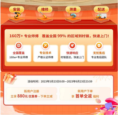 618活动期间,奇兵到家平台为了助力商家售后服务,2023年5月23日至6月23日,新用户注册立享880元优惠券,立即下单还享首单全返福利!