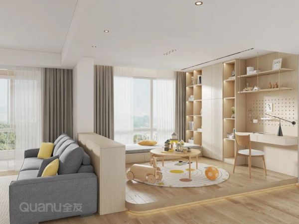客厅留出一部分空间作为亲子互动区,孩子的学习桌、玩具收纳箱、阅读书籍……都可以放置在这里,亲子互动有利于增进家长与孩子之间的情感交流。