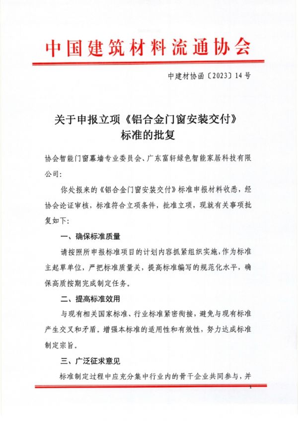《铝合金门窗安装交付》团体标准(以下简称为团标)自启动后,倍受行业关注,作为门窗行业领军品牌,富轩全屋门窗力邀行业协会领导和专家大咖参与团标制定,并联合中国建筑材料流通协会智能门窗幕墙专委会,在今年2月份正式向中国建筑材料流通协会提出申报立项,于富轩全屋门窗2023年营销战略峰会隆重举行了团标制定启动仪式,成为团标的主编单位。《铝合金门窗安装交付》标准(草案)的提出,将对门窗行业安装交付发展起到强大的助推作用。