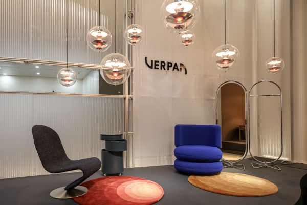 备受瞩目的 VP Globe吊灯则位于上方,一展其柔光色彩。VP Globe 的分层设计和亚克力球形灯罩,是 Panton 对工业材质的巧妙运用,塑料金属片的光泽与星体璀璨的视觉特点相联系,给人留下深刻的印象。此次也带来了全新尺寸的延伸系列,小巧精致。时至今日, Verpan也在持续为 VP Globe 尝试新的材质,从金属到玻璃,旨在为其延续设计吸引力。