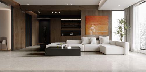 令人惊艳的是,三米之外是纯色的奇妙设计。书香轻纹系列独特之处在于“三米之外是纯色”。它融合了阿马仕灰石材纹路与人文水泥的复合轻纹理,呈现出独特的空间视觉效果。纹理与底色明亮度差≤21阶,形成“三米之外远看是纯色,近看有丰富细节”的纹理特点,有效降低纹路对视觉的冲击。砖与砖自然连纹,整体铺贴简洁素雅,为空间创造更大的留白,减少杂乱感,为家居打造最理想的空间背景。