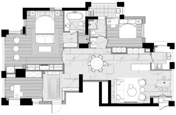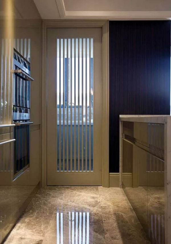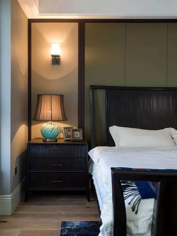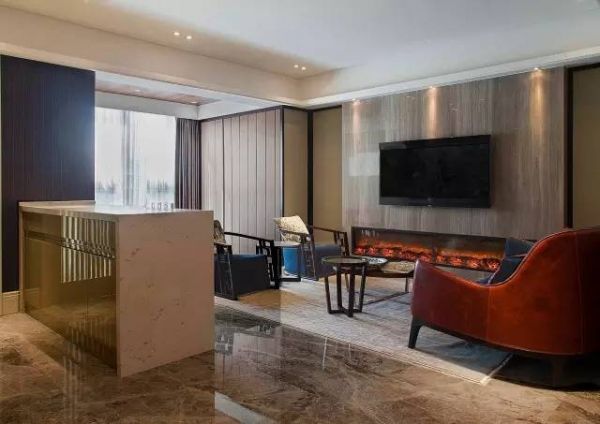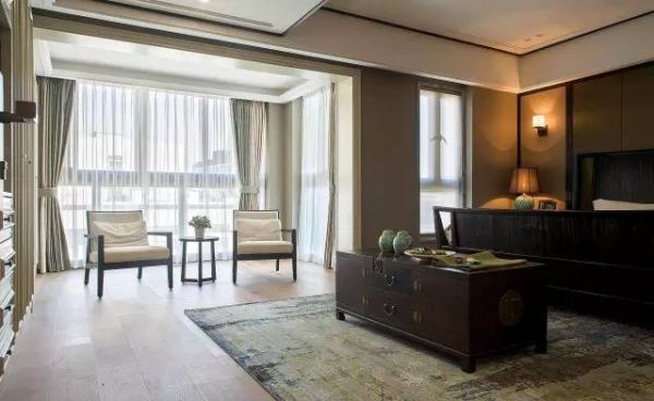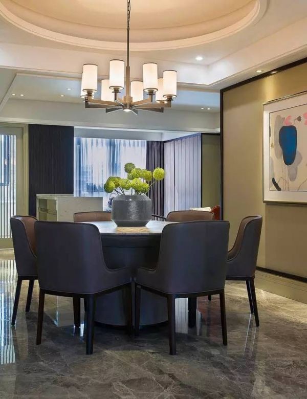 ▲运用简洁硬朗的直线条收边,材质与家具统一协调。再搭配一些中式元素的铜屏风和水墨画,使得整体空间更加丰富。大而不空,厚而不重,有格调又不显压抑。