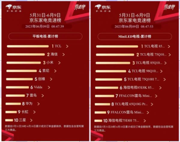 进入6月,一年一度的618年中购物狂欢节掀起了一轮又一轮狂潮,电视领域整体销量表现出色,其中TCL品牌持续领跑电视行业,以排名第一的成绩位居京东家电竞速榜-家电品牌销售排名的第一位。
