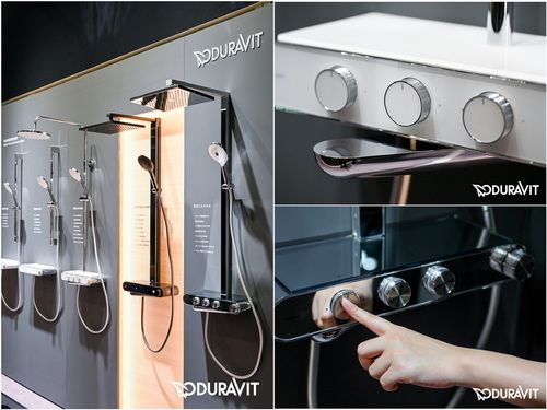 同时展出的Duravit屿境™ 平台式恒温三出水淋浴系统,在带来优质淋浴体验的同时充分考量实际使用。操控面板可分别调节各路水流大小,随心调整淋浴方案;三功能手持花洒,轻按Click! 即可便捷切换喷淋模式;360 mm 超大顶喷花洒则带来沉浸而独特的淋浴享受。置物平台宽大,为洗浴物品的摆放提供充裕空间;创新型浴缸出水嘴可旋转收纳至平台底部,节省卫浴空间同时也避免了淋浴时不必要的碰撞;而产品整体对保养清洁也十分友好,手指轻抹即可轻松拭去硅胶口上的水垢沉积物和污垢。淋浴系统指向Duravit不断丰富的产品线,对于进一步完善整体卫浴空间解决方案的意义不容小觑。