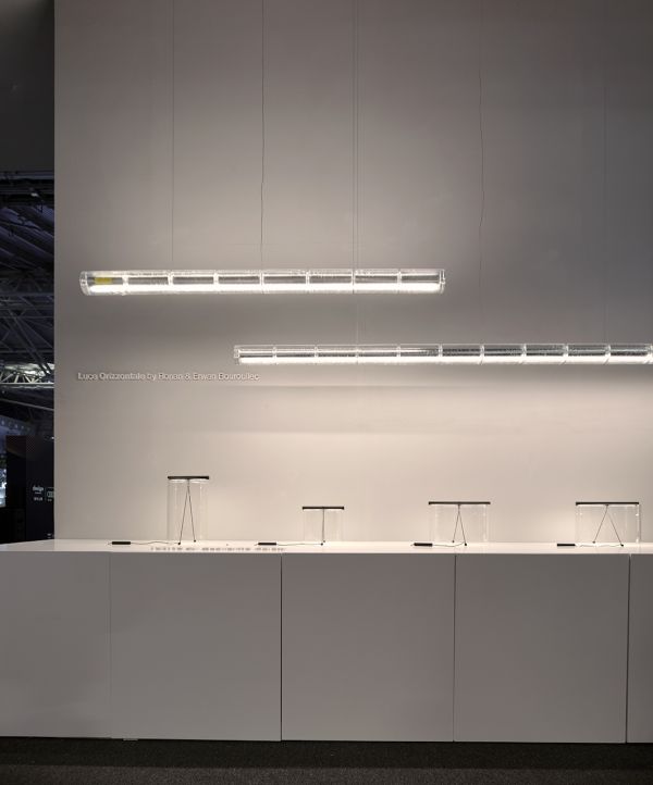 墙壁上留出的空隙让观者可以从外部一瞥内部空间的布局,同时,三组纤长的展台穿插其中,连接起观览全程。第一组展台藏在带有FLOS Logo的主墙后,用于展示以玻璃元素为主材料设计的全新作品——设计师Guglielmo Poletti 创作的To-Tie系列,以及Ronan and Erwan Bouroullec 呈现的Luce Orizzontale系列;第二组展台则集中展示了具有标志性彩色饰面的新作;而最后一个则像一个落地花盆一般,用于展示FLOS的户外系列作品。此外,2097的哑光白版本更拥有一个富有互动性的展示区,观者可以坐于灯具下,细细感知柔和光影的笼罩。