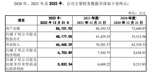 业绩方面,2020年-2022年,营业收入分别为6.24亿元、7.66亿元、6.65亿元,2022年营业收入同比降低13.21%;归母净利润分别为0.86亿元、0.73亿元、0.67亿元,2022年归母净利润同比降低8.73%。
