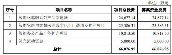 本次公开发行预计募资资金6.61亿元,资金用于智能化遮阳系列产品新建项目、智能家居与智慧医养数字化工厂改造及扩产项目、智能办公产品产能扩充项目、补充流动资金。