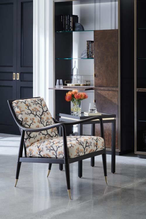在发布会现场,以一段充满优雅与和谐的黑白双人舞蹈为序章,Caracole2023春季新品代表——“心动和弦”装饰椅和“嘉宾装饰椅”闪亮登场,赢得全场观众一片惊叹。作品设计者、尖峰奖得主、设计师Christopher Sandomenico先生有着丰富的家居设计学习经历,“心动和弦”装饰椅注目于在对生活美学表现形式上的探索,它以吊桥为灵感来源,用一根曲线像线索一样将椅子的支撑结构连接起来,打破了扶手与后背的界限,实现了共融共生、和谐一体的美感;从背后观察“心动和弦”装饰椅,它又呈现放射状的金属光泽线条,如同旭日初升光芒四射,这种积极向上的意象,能为用户营造美好生活的氛围,表现力极强。从工艺上看,“心动和弦”后背与扶手的一体化实施难度较高,既要实现对使用者的人体工程学,又要与软包部分拼接。另一件作品“嘉宾装饰椅”,它是传统经典的温莎椅和美国战役家居的结合,在扶手处又进行了更加现代化的设计语言处理,形成对经典的元素的传承和创新。这两件作品均体现了Caracole在设计上大胆创新、不断突破的不懈追求。