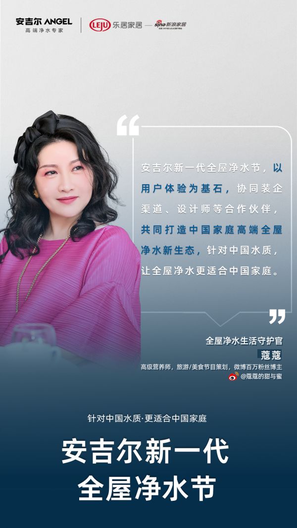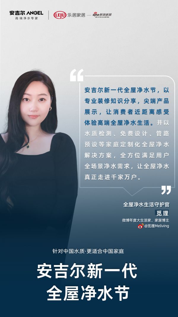 “安吉尔新一代全屋净水节,担当中国家庭全屋用水科普和教育重任,从现场体验、知识分享到净水设计、星级服务,为中国家庭带来全面升级的全屋净水创新解决方案,让全屋净水成为高品质家装之标配。”