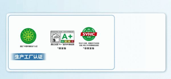 全球公认的权威安全认证。针对产品近360种有机挥发物包括致癌物的释放量进行监测,针对生产过程严格把关。动态抽检,确保质量始终如一,全链路全面认证,以确保其有机挥发物释放量趋于0,产品更绿色、更安全