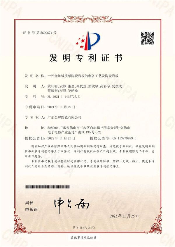 这并不是中陶君胡乱猜测,事实上,金牌亚洲是金丝绒柔光砖的首创品牌是有认证依据的。据了解,金牌亚洲拥有金丝绒柔光砖的独家产品技术专利,名为“一种金丝绒质感陶瓷岩板的制备工艺及陶瓷岩板”。该专利证书由国家知识产权局于2022年11月25日颁发,证书内容显示,金牌亚洲是在2021年11月29 日申请的。