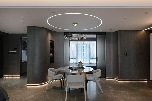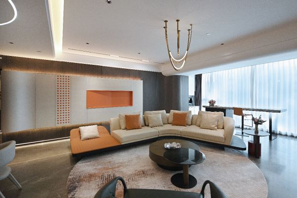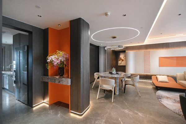 陈柱强:当爱马仕橙遇上高级灰,演绎高雅与奢华的极致魅力。整个活动空间,运用原墨染的天然木皮一体化木作设计加上爱马仕橙,是素雅与美艳的合体。丝滑的圆弧门墙衔接与悬空科技感的魔法线灯条是最大的亮点。沙发背景墙波点式与嵌入格的设计,像是嵌入皮革里面的精致卡扣。大型落地窗+茶水柜+吧台的结合,让生活提升不少仪式感。吧台的设计以天然木皮收纳柜+大理石台面+渐变的亚克力支撑,凸显出一份低调与雅奢,惬意自在。客厅、餐厅形成共通互享的空间,以及畅通无阻的动线,让家人们能够有足够多的相处、互动的时间和空间。极具科技感的电视收纳柜+仙气飘飘的壁炉设计,也俘虏了不少少女心。
