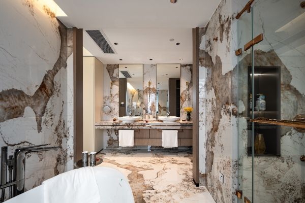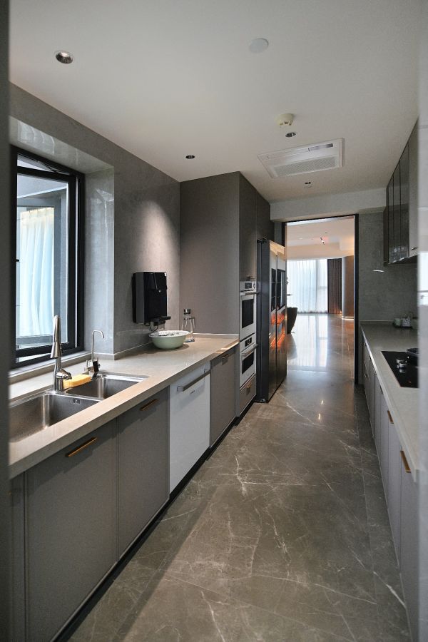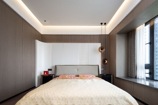 主卧采用瓷砖与地板双拼设计,细节无缝衔接。主人最喜爱的浴室区域,采用三面连纹的潘多拉岩板,形成一个错落有致的“异度空间”。而卫浴柜则使用木作,温润调和空间的冷却感。空间流淌着一种律动,光影变幻,左右通达,浓淡相宜,滋味万千。开放式的主卧布局、方圆有度、行云流水。在一体化轮廓之内,定格下舒畅喜悦的休息场景。