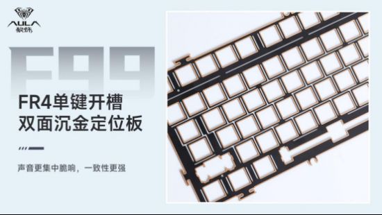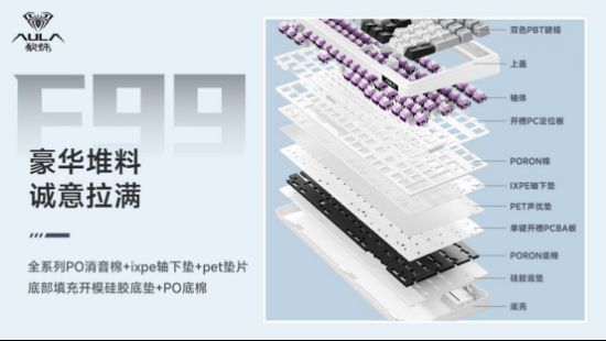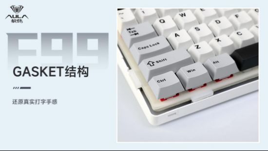 F99采用现下流行的Gasket结构,软弹的材质让打字非常舒适,长时间打字不增加负担,流畅感倍增。