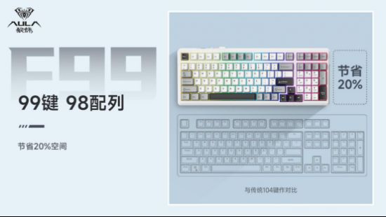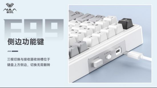 8000mAh大电池、1680万色RGB光效、三模连接方式。F99搭载灵动轴V3、紫皇轴、鲸海轴3款轴体,共有6个版本可选。