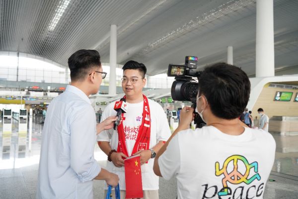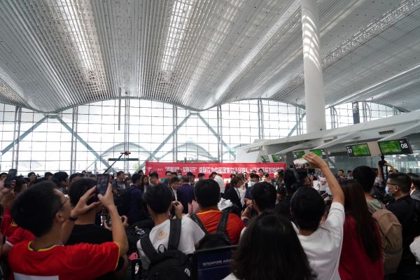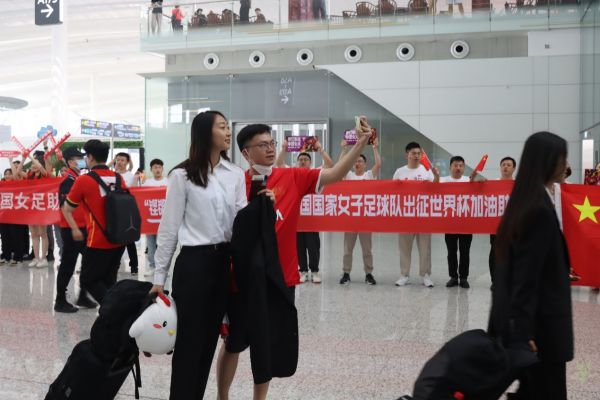 在机场,紫荆花加油助威队早早赶来,举着中国女足专属“应援牌”翘首以待。10时许,身穿统一黑西装制服的女足姑娘们推着行李亮相,大批球迷们纷纷鼓掌、呐喊助威,现场气氛热情高涨,场面十分暖心。