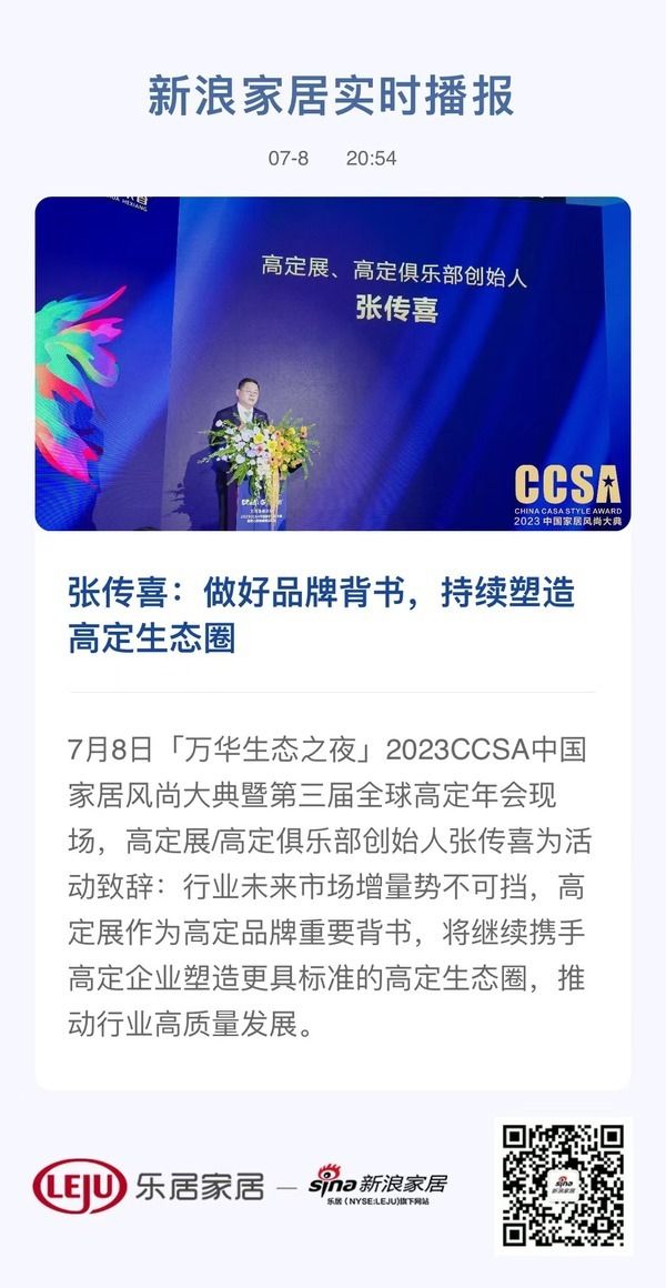7月8日「万华生态之夜」2023CCSA中国家居风尚大典暨第三届全球高定年会现场,高定展/高定俱乐部创始人张传喜为活动致辞:行业未来市场增量势不可挡,高定展作为高定品牌重要背书,将继续携手高定企业塑造更具标准的高定生态圈,推动行业高质量发展。
