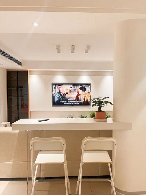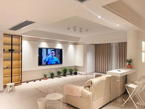 书吧设计在客厅沙发背后,打破传统的书吧定义,柔和的米色赋予空间更温柔的氛围,还带来一种新奇的视觉体验,增加空间趣味性与层次感。