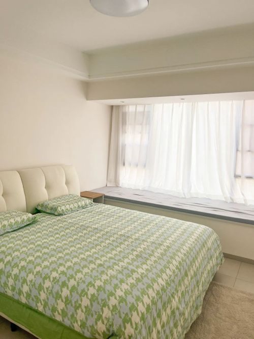 主卧的功能需求,就好比我们人生的AB面,既要装得下我们对事业的自信与坚定,也能装得下我们对生活的不将就。卧室瓷砖继续沿用低饱和度浅色系的冠珠丹宁-米灰岩板,质感温柔细腻,让人可以轻松卸下身上的压力。绿色和红色床品,与空间形成视觉层次感,整个氛围活跃起来。