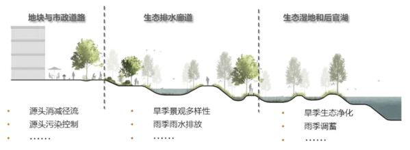 生态排水体系由三个密切相关的体系构成,包括源头的地块与道路、中途的生态排水廊道以及末端的湿地链。