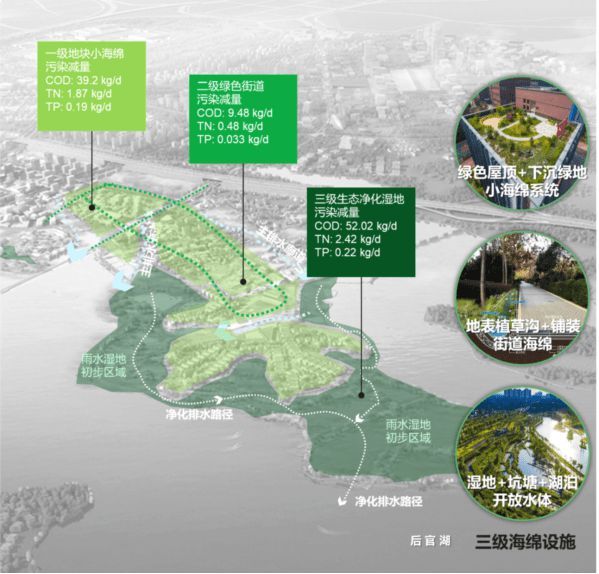 通过源头的海绵管控、中间的绿色街道和廊道、末端的湿地三级净化控制项目区的水质,使其达到远期三类水排湖的目标。
